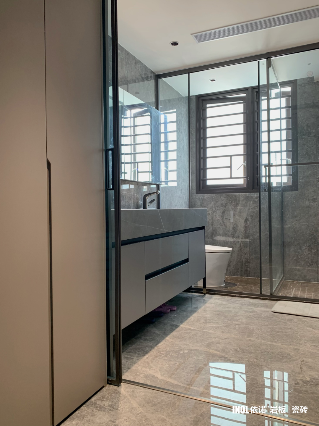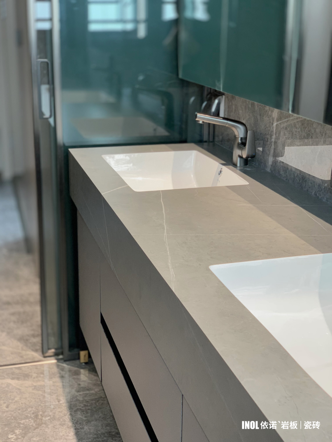 高級灰?guī)r板應(yīng)用在衛(wèi)浴空間,從容淡然間帶來的安靜力量,讓居住者靜享私人時刻;雙臺盆設(shè)計搭配巖板材質(zhì),既發(fā)揮了巖板防潮防霉的性能,還帶來五星級的洗漱享受。